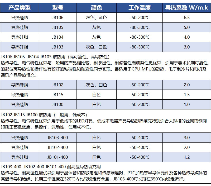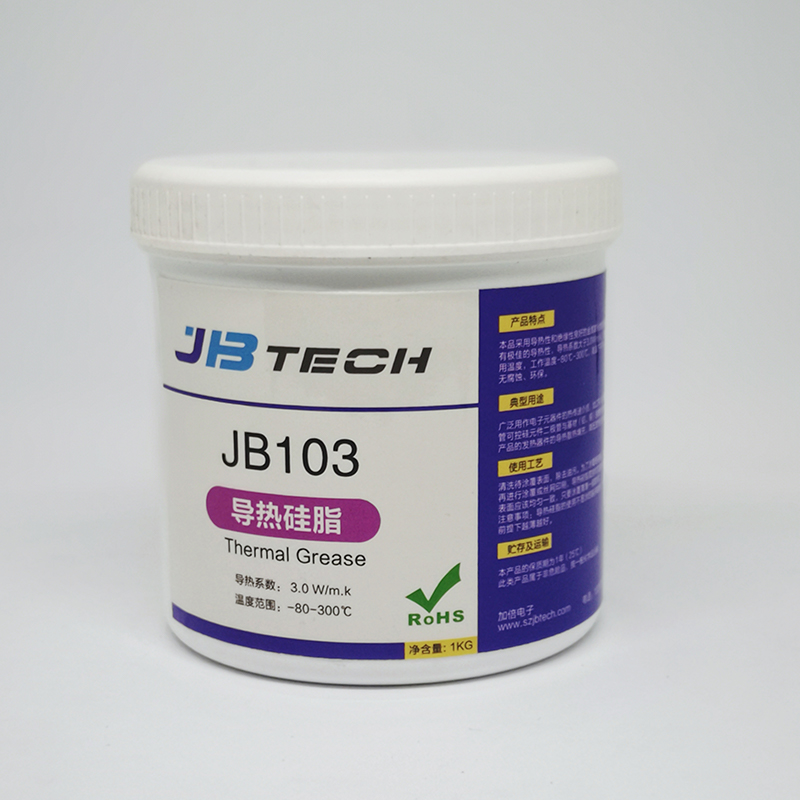 高导热散热膏JBTECH高导热散热膏可以有效降低散热器及发热源之间的接触热阻。适用于需要最小压缩厚度、恒定压力和易于丝网印刷以获得最佳性能的应用场合。JBTECH高性能硅脂产品的设计宗旨是通过消除泵出